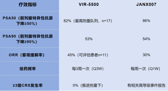 从数据来看,VIR-5500与JANX007在PSA反应率上几乎旗鼓相当,但在客观缓解率上具有明显优势;更关键的是,VIR-5500的给药频率更具便利性——每3周一次的给药方案,相较于每周一次的JANX007,能够显著提升患者依从性,尤其适合前列腺癌这类慢性肿瘤的长期治疗,在真实世界应用中更具竞争力。