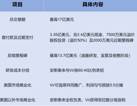 此次合作呈现典型的“现金+股权+高额里程碑”模式。根据双方协议,Vir将获得总计最高17亿美元的交易额,具体条款如下:
