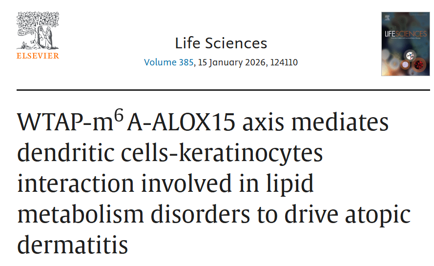 2026年 《Life Sciences》 发表的研究深入探讨了RNA表观修饰在AD中的作用。研究发现,AD皮损中树突状细胞的ALOX15表达显著上调,且与疾病严重程度相关。机制上,m6A甲基转移酶WTAP通过m6A修饰增强ALOX15表达,促使DC活化并分泌大量炎症因子及花生四烯酸代谢产物(LTB4、12-HETE、15-HETE)。这些代谢物进而导致角质形成细胞分化异常、增殖紊乱及脂质代谢障碍——这正是AD特征性的表型变化。该WTAP-m6A-ALOX15轴的确立,为靶向“脂质代谢重编程”和“DC-角质形成细胞对话”提供了新的干预切入点。