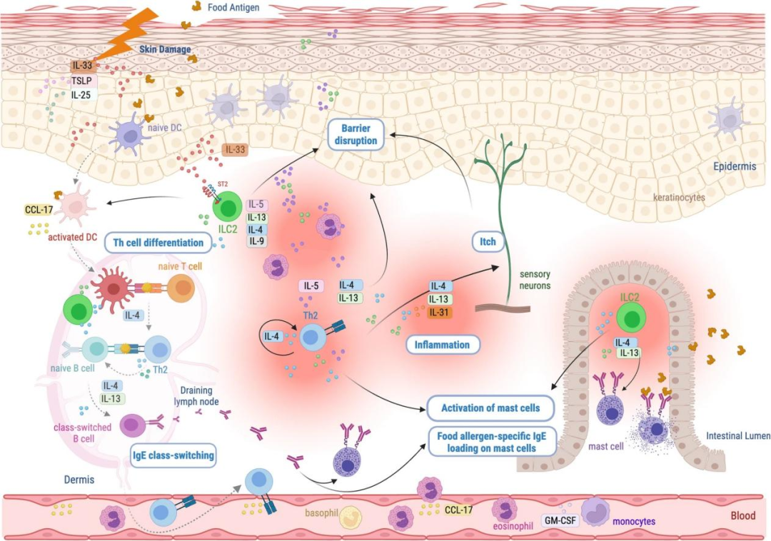 《Clinical Reviews in Allergy & Immunology》的综述系统阐述了2型先天淋巴细胞(ILC2) 在特应性进程中的核心作用。在屏障受损的皮肤中,IL-33激活ILC2,后者不仅产生IL-5和IL-13,还通过“远程启动”机制促进肠道肥大细胞增殖及IgE类别转换,从而介导食物过敏的发生。值得注意的是,虽然外用糖皮质激素(TCS)可改善皮损,但婴儿AD患者经TCS治疗后,角质层中IL-5和IL-13仍持续升高,提示ILC2在局部持续活跃,这解释了为何单纯激素治疗难以阻断特应性进程。