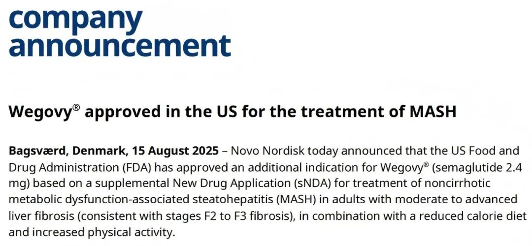 2025年8月15日,FDA基于一份补充新药申请(sNDA)批准了诺和诺德重磅产品司美格鲁肽(2.4mg)的新适应症,用于治疗伴中度至重度肝纤维化(F2-F3期)的非肝硬化MASH成人患者,该疗法需联合低热量饮食及增加体力活动。此次获批使司美格鲁肽成为全球首个且唯一获批用于治疗MASH的GLP-1受体激动剂。