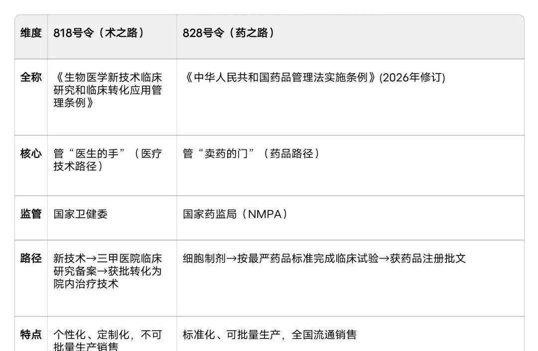 简单来说,818号令管的是在医院里给病人用的个性化技术,而828号令管的是可以像普通药品一样批量生产、全国销售的细胞药。